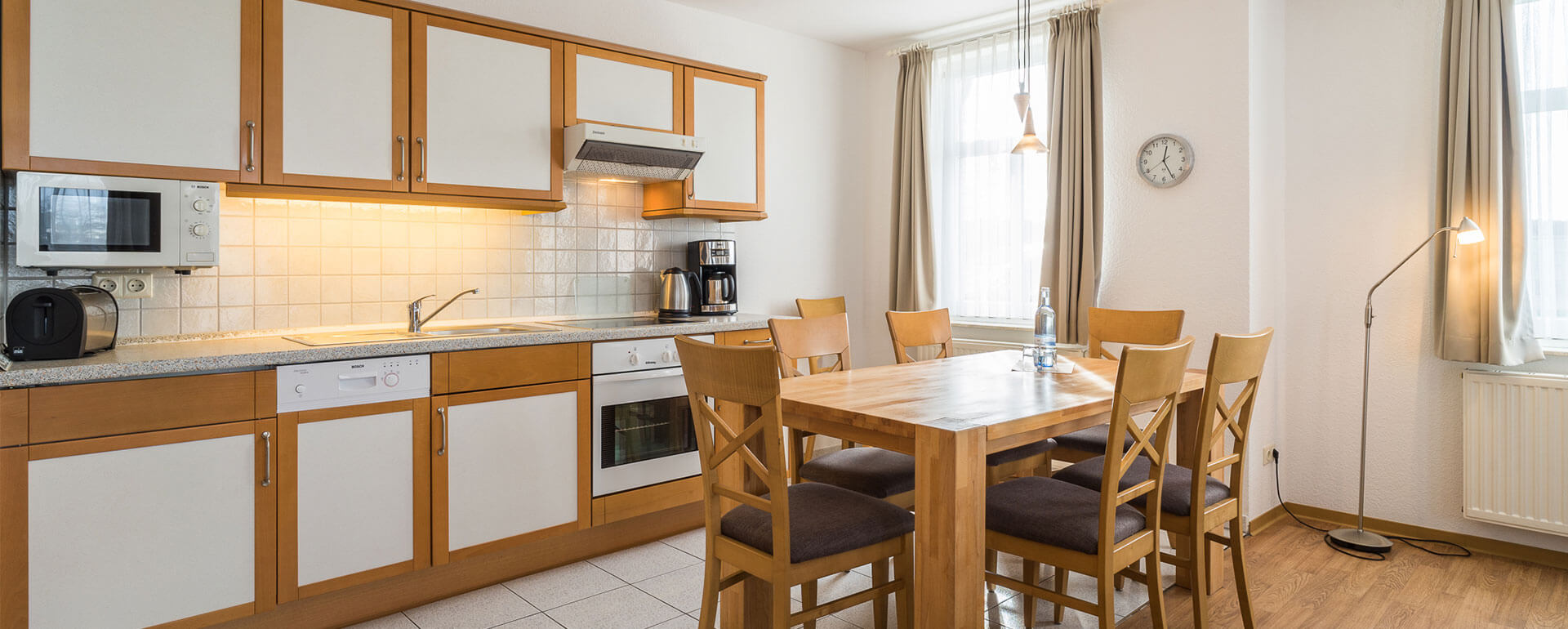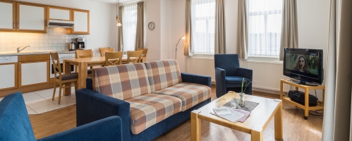 Neben der gehobenen Ausstattung verfügt die Wohnung über Kabel-TV, Radio und kostenfreien Internetzugang. Die voll ausgestattete Küche lässt viel Raum für Ihre Kreativität. So stehen Backofen, Mikrowelle, Toaster, Kaffemaschine und Ceranfeld zu Ihrer Verfügung, während sich der Abwasch dank Spülmaschine von allein erledigt. Münzwaschmaschine und -trockner stehen zur Verfügung.